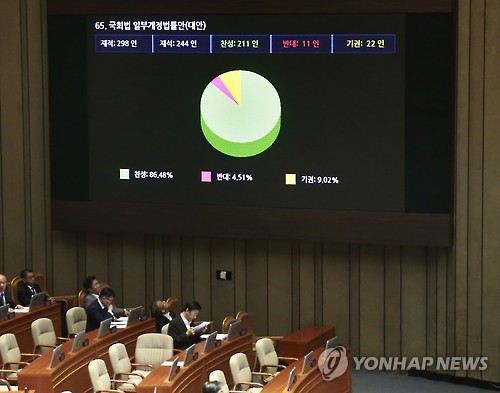 | △ 국회법 일부개정법률안 통과 (서울=연합뉴스) 이상학 기자 = 29일 국회에서 열린 제333회 국회(임시회) 제3차 본회의에서 국회법 일부개정법률안이 통과되고 있다. 2015.5.29 leesh@yna.co.kr |