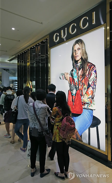 (서울=연합뉴스) 고유선 기자 = 수입 잡화브랜드 구찌가 이번 시즌 일부 제품을 50% 할인 판매하면서 매장이 고객들로 붐비고 있다.