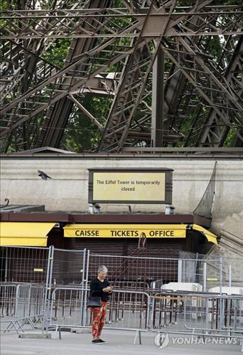 | △ (파리 AP=연합뉴스) 프랑스 파리의 명물 에펠탑이 최근 소매치기의 극성에 항의하는 직원들의 파업으로 22일(현지시간) 문을 닫은 가운데 한 관광객이 휴대전화를 작동하고 있다. |