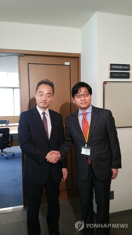 | △ 조선인 강제노동 시설이 포함된 일본의 근대산업시설 세계유산 등재 추진과 관련한 한일간 양자협의가 열린 지난 22일 양국 수석대표인 최종문 외교부 유네스코 협력대표(오른쪽, 차관보급)와 신미 준(新美潤) 일본 외무성 국제문화교류심의관(국장급)이 도쿄 일본 외무성 청사에서 협의를 시작하기 앞서 악수하고 있다. (주일한국대사관 제공) |