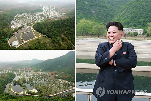 | △ 북한 신창양어장과 김정은 (서울=연합뉴스) 김정은 북한 국방위원회 제1위원장이 제810군부대 산하 신창양어장을 시찰했다고 노동신문이 15일 보도했다. 김 제1위원장이 양어장에서 담배를 피우고 있다. 피우며 수행한 가운데 김 제1위원장이 환한 표정으로 웃고 있다. 2015.5.15 nkphoto@yna.co.kr |