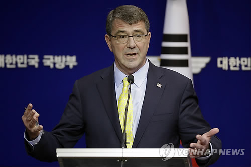 카터 장관은 이날 싱가포르에서 열린 제14차 아시아안보회의(일명 샹그릴라 대화)에서 한민구 국방부 장관과 양자 회담을 하며 이 같이 말했다고 국방부 관계자가 밝혔다.