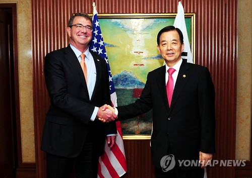 (싱가포르=연합뉴스) 이영재 기자 = 한민구 국방부 장관과 애슈턴 카터 미국 국방부 장관은 30일 싱가포르에서 국방장관회담을 하고 "북한의 위협과 도발을 결코 용납하지 않을 것"이라는 데 의견을 같이했다.