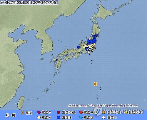 | △ 도쿄 남쪽 북태평양에 강진 (도쿄=연합뉴스) 30일 오후 8시 24분께 일본 도쿄도(東京都) 남쪽 북태평양에 있는 오가사와라(小笠原)제도 인근에서 강한 규모 8.5(추정치)의 강한 지진이 발생했다. 사진은 일본 기상청이 공개한 지진의 영향을 표시한 지도. 태평양 상에 X 표시가 된 곳이 진앙. 2015.5.30 <<일본 기상청 홈페이지 캡처>> sewonlee@yna.co.kr |