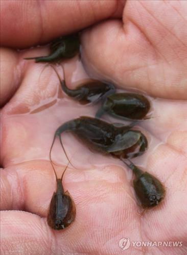 (괴산=연합뉴스) 변우열 기자 = '살아있는 화석생물'로 불리는 긴꼬리 투구새우의 집단 서식이 충북 괴산군의 논에서 3년째 확인됐다.