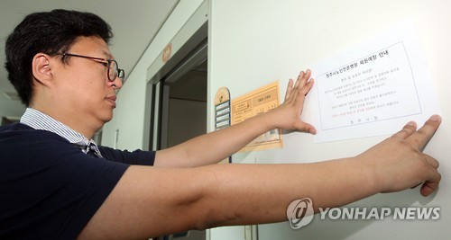 | △ 청주시노인병원 폐쇄예정 안내문 (청주=연합뉴스) 김형우 기자 = 31일 오전 청주시 서원구 노인전문병원에서 청주시 관계자가 폐쇄예정 안내문을 현관 출입문에 부착하고 있다. 2015.5.31 vodcast@yna.co.kr |