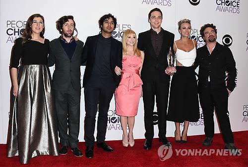 | △ 지난 1월 피플츠 초이스 어워즈 시상식에 나온 빅뱅이론 출연진 사진 왼쪽부터 마이엄 비알릭, 사이먼 헬버그, 쿠날 나야르, 멜리사 라우시,짐 파슨스, 케일리 쿼토-스위팅, 조니 갈레키 |