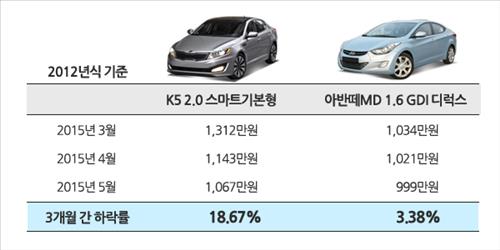 1일 중고차사이트 '카즈'에 따르면 올해 3월 1천312만원선에서 거래되던 2012년식 K5 2.0 스마트 기본형 모델은 5월에는 1천67만원선에 거래돼 두 달 만에 250만원이나 하락했다.