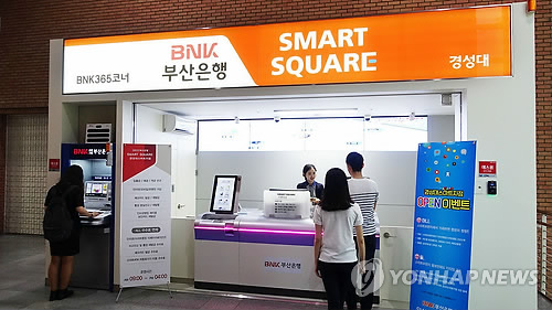 | △ 부산은행, 경성대에 스마트지점 개점 (부산=연합뉴스) BNK금융지주 부산은행이 18일 경성대에 스마트 지점인 스마트 스퀘어를 개점했다. 2015.5.18 joseph@yna.co.kr |