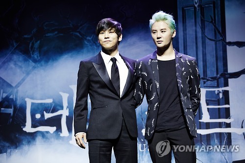 | △ 뮤지컬 '데스노트' 주연 홍광호, 김준수 (서울=연합뉴스) 오는 20일 경기도 성남아트센터에서 개막하는 뮤지컬 '데스노트'의 주연 배우 홍광호와 김준수가 1일 서울 반포 가빛섬에서 열린 기자회견에서 포즈를 취하고 있다. 2015.6.1 << 씨제스컬쳐 제공 >> photo@yna.co.kr |