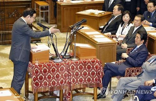 | △ (도쿄 교도=연합뉴스) 5월20일 일본 국회에서 열린 당수토론에서 시이 가즈오(志位和夫, 왼쪽) 일본공산당 위원장이 아베 신조(安倍晋三) 일본 총리에게 질문을 하는 모습. |