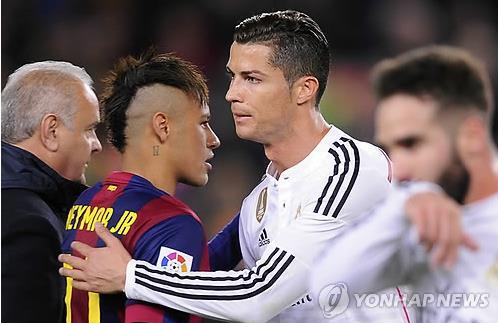 | △ 포옹하는 네이마르(바르셀로나)와 크리스티아누 호날두(레알 마드리드).(AP=연합뉴스 자료사진) |
