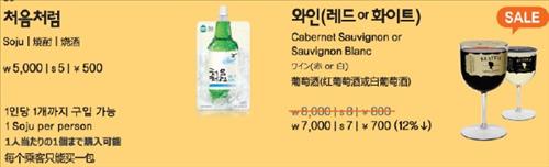 소주는 만 19세 이상 승객 1인당 1개씩만 살 수 있고, 소주를 포함해 맥주(4천원)와 와인(7천원) 등 주류는 승무원의 판단에 따라 구매를 제한할 수 있다.