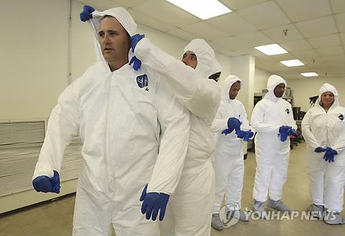 | △ 지난해 10월 미국 내 에볼라 감염 환자 발생 당시 보호복을 입는 군인들 (AP=연합뉴스) |
