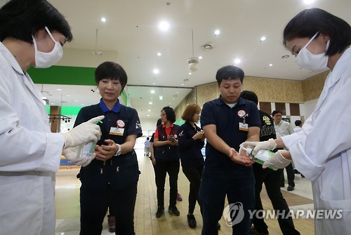 | △ 손 소독 실시하는 대형마트 직원들 (서울=연합뉴스) 양지웅 기자 = 중동호흡기증후군(메르스) 환자가 연일 늘어나고 있는 2일 서울의 한 대형마트에서 직원들이 손 소독을 실시하고 있다. 2015.6.2 yangdoo@yna.co.kr |