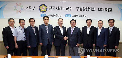 | △ 교육부-전국 시장·군수·구청장협의회 MOU 체결 (서울=연합뉴스) 황우여 부총리 겸 교육부 장관이 3일 오후 정부서울청사에서 조충훈 전국 시장·군수·구청장협의회 회장(오른쪽에서 네 번째)과 중학교 자유학기제 및 진로체험활동 지원을 위한 업무협약을 체결한 뒤 기념촬영을 하고 있다. << 교육부 제공 >> scoop@yna.co.kr |