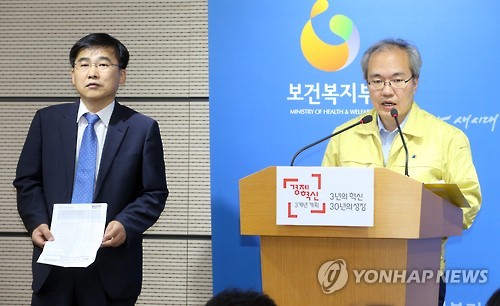 | △ 메르스 상황 브리핑 (세종=연합뉴스) 배재만 기자 = 중앙메르스관리대책본부 기획총괄반장인 권준욱 보건복지부 공공보건정책관이 3일 오전 정부세종청사 공용브리핑룸에서 열린 정례브리핑에서 취재진의 질문에 답하고 있다. 왼쪽은 김우주 대한감염학회 이사장. |
