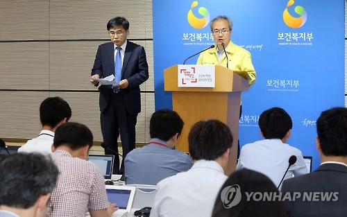 | △ 메르스 상황 브리핑 (세종=연합뉴스) 배재만 기자 = 중앙메르스관리대책본부 기획총괄반장인 권준욱 보건복지부 공공보건정책관이 3일 오전 정부세종청사 공용브리핑룸에서 열린 정례브리핑에서 취재진의 질문에 답하고 있다. 왼쪽은 김우주 대한감염학회 이사장. |