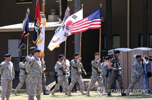 | △ 입장하는 태극기와 성조기 (의정부=연합뉴스) 임병식 기자 = 3일 오후 경기도 의정부시 캠프 레드클라우드에서 열린 한미연합사단 편성식에서 태극기와 성조기가 입장하고 있다. 2015.6.3 andphotodo@yna.co.kr |