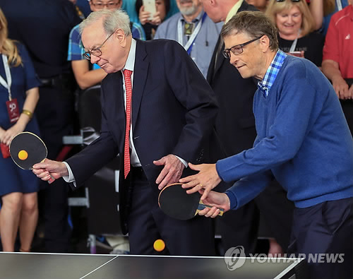 | △ 버핏-게이츠 "우린 탁구 복식조" (오마하<미 네브래스카주> AP=연합뉴스) 월가 '투자 귀재' 워런 버핏은 '가치 투자' 원칙은 국경을 초월해 모든 시장에 적용되는 것이라고 강조했다. 버핏은 지난 2일 자신이 회장 겸 최고경영자(CEO)로 있는 투자회사 버크셔 해서웨이 연례 주총 일문일답에서 이같이 말했다. 버핏이 3일 빌 게이츠 마이크로소프트 공동창업자와 함께 탁구 시합에 나선 장면이다. Berkshire Hathaway Chairman and CEO Warren Buffett, left, and Microsoft co-founder Bill Gates play table tennis against prodigy Ariel Hsing, unseen, outside the Borsheims jewelry store, a Berkshire Hathaway subsidiary, in Omaha, Neb., Sunday, May 3, 2015. The annual Berkshire shareholders weekend is coming to a close one day after more than 40,000 people attended a question and answer session with Warren Buffett and his Vice Chairman Charlie Munger. (AP Photo/Nati Harnik) |