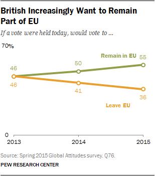 퓨리서치센터(Pew Research Center)가 영국, 독일, 프랑스, 이탈리아, 스페인, 폴란드 등 EU 회원국 6개국의 6천28명을 대상으로 조사해 3일(현지시간) 공개한 여론조사 결과에 따르면 영국인 응답자의 55%가 EU 잔류를 지지했다.
