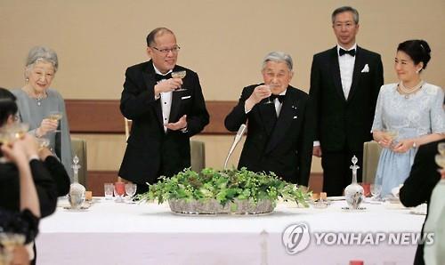 | △ (도쿄 교도=연합뉴스) 아키히토(明仁) 일왕(오른쪽에서 3번째)이 3일, 일본을 국빈 방문 중인 베니그노 아키노 필리핀 대통령(오른쪽에서 4번째)을 위한 궁중 만찬회에서 건배하고 있다. |