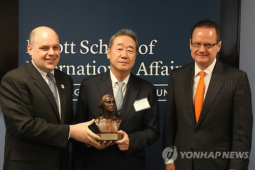 (워싱턴=연합뉴스) 노효동 특파원 = 장대환 매경미디어그룹 회장이 3일(현지시간) 미국 조지워싱턴 대학에서 '자랑스러운 동문상'(Distinguished Alumni Achievement Award)을 받았다.