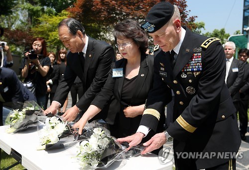 | △ '6·25전쟁 미국인 희생자 추모식' (서울=연합뉴스) 김수진 기자 = 28일 오전 서울 마포구 합정동 양화진 외국인 묘원에서 열린 '6·25전쟁 미 참전용사와 미국인 안장자를 위한 합동 추모식'에서 박승춘 국가보훈처장(왼쪽부터), 홍승옥 한미친선연합회장, 버나드 샴포 미 8군 사령관이 헌화하고 있다. 2015.5.28 ksujin@yna.co.kr |