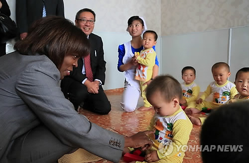 | △ WFP사무총장 만난 北육아원 원아들 (서울=연합뉴스) 세계식량계획(WFP)의 어서린 커즌 사무총장이 지난해 북한 평안남도 평성시의 한 육아원을 찾아 원아들을 만나고 있다. <<WFP/Marco Frattini 제공>> photo@yna.co.kr |