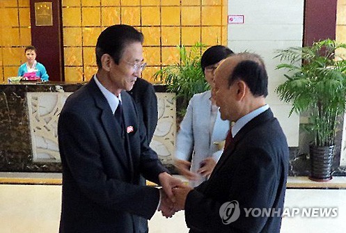 | △ 6·15 남북공동행사 무산 (서울=연합뉴스) 남북 민간단체가 추진하던 6.15 공동선언 발표 15주년 기념 공동행사가 무산돼 남한과 북한에서 각각 행사를 개최하게 됐다. 5월5일 중국 선양 한 호텔에서 남과 북 측 준비위원회 대표단이 만나 인사를 나누고 있다. 왼쪽은 북측 대표인 김완수 6·15공동선언실천 북측위원회 위원장, 오른쪽은 남측 대표인 이창복 상임대표의장. 2015.6.2 << 연합뉴스 DB >> photo@yna.co.kr |