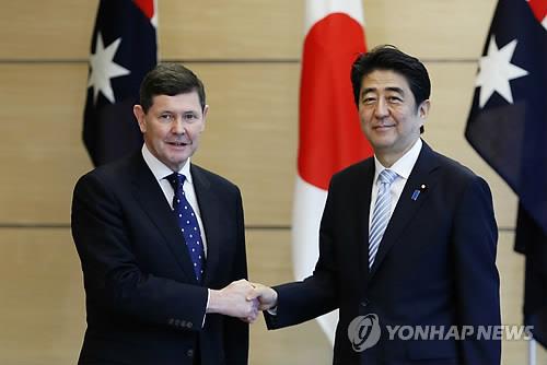 | △ (도쿄 AP=연합뉴스) 아베 신조 일본 총리가 3일 도쿄의 총리관저를 찾은 케빈 앤드루스 호주 국방장관(왼쪽)과 악수하고 있다. |