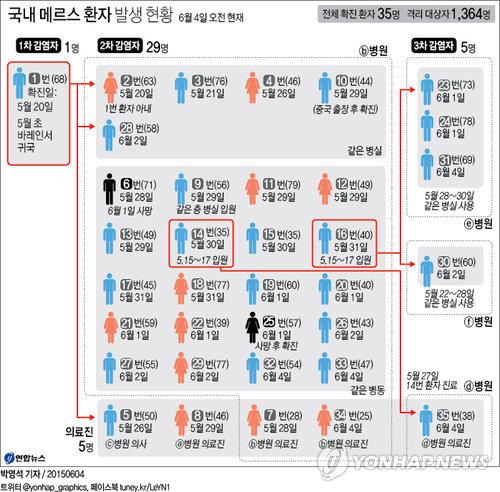 (서울=연합뉴스) 김병규 기자 = 중동호흡기증후군(메르스) 3차 감염 환자가 4일 새벽 2명 더 추가되면서 5명으로 늘었다.