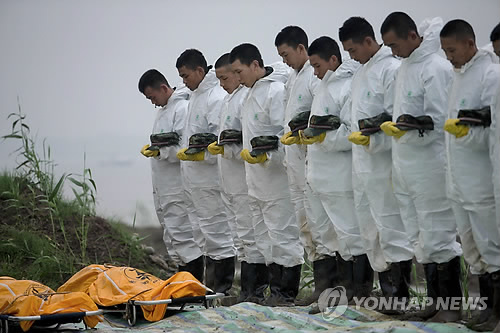 | △ 빨리 구하지 못해 안타까운 마음뿐 (후베이<중국> EPA=연합뉴스) 중국 양쯔강 유람선 침몰사고가 발생한 지 사흘째인 3일(현지시간) 구조대원들이 이날 수습한 희생자 시신을 앞에 둔 채 묵념하고 있다. |
