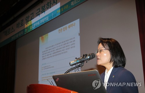 | △ 개회사 하는 장옥주 보건복지부 차관 (서울=연합뉴스) 이정훈 기자 = 장옥주 보건복지부 차관이 4일 오후 서울 중구 포스트타워에서 메르스 민·관합동대책반 주최로 열린 '메르스, 바로 알고 극복하자' 세미나에서 개회사를 하고 있다. |