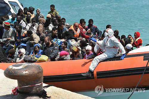 | △ (라구사<이탈리아 시칠리아섬> AP=연합뉴스) 유럽연합(EU) 회원국들이 지중해상 난민 참사를 방지하고 불법 난민 유입을 저지하기 위한 해군작전 계획을 승인한 가운데 5월 19일(현지시간) 시칠리아섬 라구사 근처 포짤로 항에 난민들을 태운 이탈리아 해안경비정이 도착하고 있다. |
