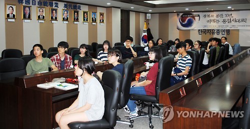 | △ 자유총연맹, 고교생 통일준비 아카데미 (서울=연합뉴스) 한국자유총연맹이 지난달 9일부터 매주 토요일 고교생들을 대상으로 역사, 통일, 안보, 리더십 등을 주제로 통일준비 아카데미를 열었다. 지난달 23일 연맹 본부에서 한영외고 등 수도권 고교 학생들이 아카데미 강연을 경청하고 있다. 2015.6.5 << 한국자유총연맹 제공 >> photo@yna.co.kr |