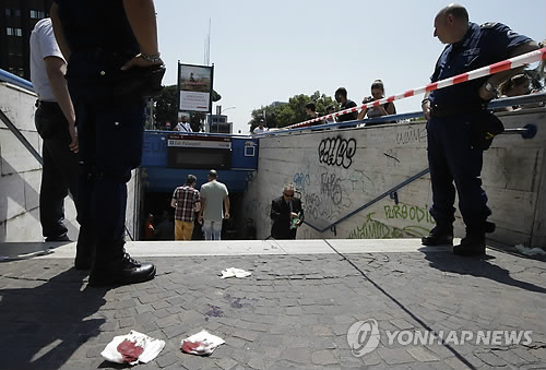 | △ 伊 로마 지하철 추돌…21명 부상 (로마 AP=연합뉴스) 이탈리아 로마의 한 지하철 역 인근에서 5일(현지시간) 대기 중이던 열차를 다른 열차가 추돌, 21명이 부상했다. 사진은 사고 지하철 역 주변을 경찰이 지키고 있는 모습. 땅바닥에 부상자들의 피 흔적이 보인다. |