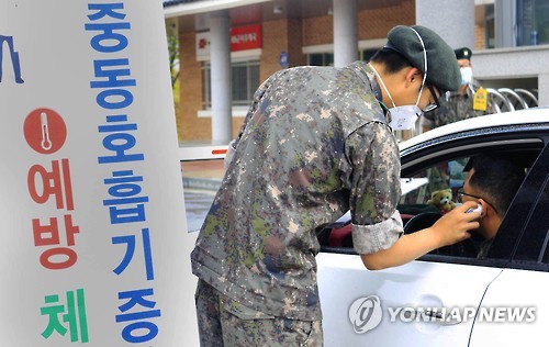 | △ 군 부대서 발열 검사 (임실=연합뉴스) 전북 임실에 있는 육군 35사단 의무장병이 5일 오전 메르스 예방을 위해 위병소에서 출근 장병과 출입 민간인을 대상으로 발열 검사를 하고 있다. 부대는 24시간 체온체크 중이다. |