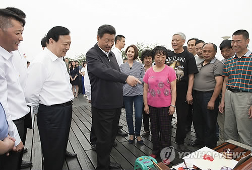 | △ 시진핑은 지금 지방 시찰 중 (항저우 AP=연합뉴스) 지방시찰에 나선 시진핑 중국 국가주석(가운데)이 26일(현지시간) 저장성 항저우에서 현지 주민들을 만나 얘기를 나누고 있다. marshal@yna.co.kr In this Tuesday, May 26, 2015 photo released by China's Xinhua News Agency, Chinese President Xi Jinping talks with local people in Hangzhou, capital of east China's Zhejiang Province when Xi had a three-day inspection tour in the province. Rapturous crowds. Beaming workers. Pep talks for the troops. The TV coverage Thursday, May 28 of Chinese president's recent visit to the eastern province was a tour de force of Communist propaganda, showcasing what's seen as an emerging cult of personality around the country's strongest leader in decades. (Xie Huanchi/Xinha via AP) NO SALES |