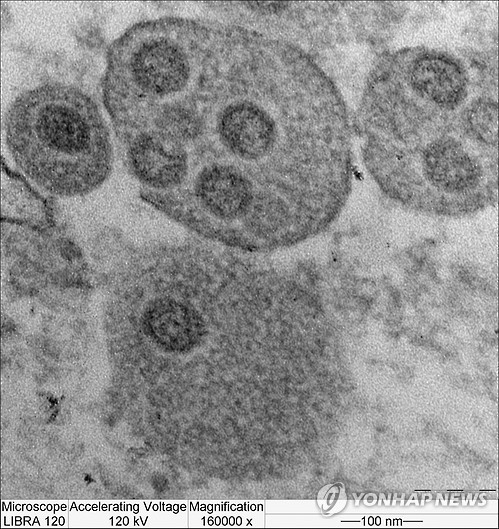 | △ 세포내 발견된 메르스 바이러스 (서울=연합뉴스) 보건복지부 질병관리본부 국립보건연구원 이주실 원장은 6일 정부세종청사에서 열린 브리핑에서 국내에 유입된 메르스 바이러스는 변이가 안됐다고 밝혔다. 전자현미경 16만 배율로 본 세포내 있는 국내 메르스 바이러스. 2015.6.6 << 보건복지부 >> photo@yna.co.kr |