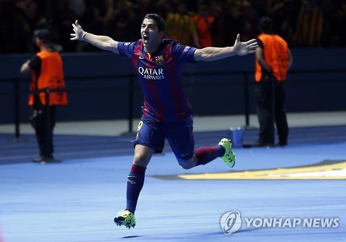 | △ 결승골을 터트린 바르셀로나의 루이스 수아레스가 두 팔을 벌려 환호하고 있다.(AP=연합뉴스) |