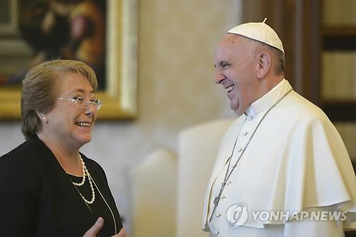 | △ 프란치스코 교황(오른쪽)이 지난 5일(현지시간) 바티칸에서 미첼 바첼레트 칠레 대통령을 만났다.(바티칸 AP=연합뉴스) |
