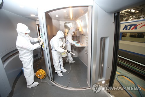 | △ 메르스 예방 위해 KTX 열차 방역 (서울=연합뉴스) 코레일 직원과 방역업체 직원들이 5일 KTX 고양차량기지에서 메르스 예방대책의 하나로 KTX 열차에 대한 살균소독과 방역 작업을 하고 있다. (코레일 제공) |