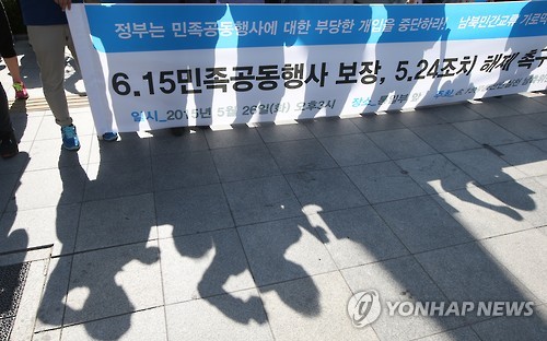 | △ '5.24조치 해제 촉구' (서울=연합뉴스) 서명곤 기자 = 지난달 26일 오후 서울 세종로 정부 서울청사 앞에서 6·15 공동선언실천 남측위원회가 주최한 '6.15민족공동행사 보장, 5.24조치 해제 촉구 기자회견에서 참가자들이 5·24 조치 해제를 촉구하는 구호를 외치고 있다. 2015.6.8. |