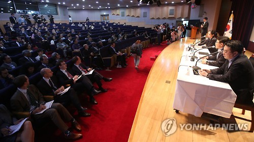 | △ 정부 주한 외교단 상대로 메르스 설명회 (서울=연합뉴스) 황광모 기자 = 주한 외국대사관 대표들이 8일 오후 서울 도렴동 외교부 청사에서 열린 '한국 내 중동호흡기증후군(메르스) 현황과 한국 정부의 대응 조치'에 대한 브리핑에 참석해 정부 관계자의 현황 보고를 주의 깊게 듣고 있다. 이 브리핑에는 78개국의 주한 대사관 대표들이 참석했으며, 정부에서는 외교부, 보건복지부, 민간 감염전문의가 참석해 한국의 메르스 대응 상황에 대해 설명했다. |