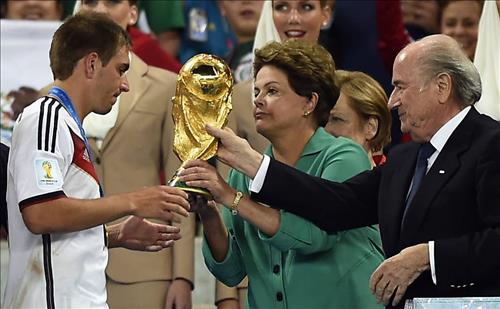 | △ 지우마 호세프 브라질 대통령(가운데)과 제프 블라터 FIFA 회장이 2014년 월드컵 결승전에서 우승을 차지한 독일 대표팀 주장에게 우승컵을 전달하고 있다. |