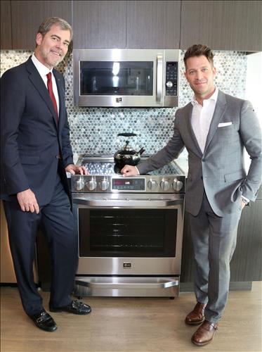 | △ LG전자가 미국 유명 인테리어 디자이너 '네이트 버커스'가 디자인에 참여한 프리미엄 빌트인 'LG 스튜디오(LG Studio)' 신제품을 미국 LA 도심의 고급 아파트 ‘멧 로프츠(Met Lofts)’에 전시했다. '네이트 버커스'와 미국 법인 마케팅 총괄 '데이빗 반더월(David Vanderwaal)'이 'LG 스튜디오' 오븐레인지와 전자레인지 앞에서 포즈를 취하고 있다. |