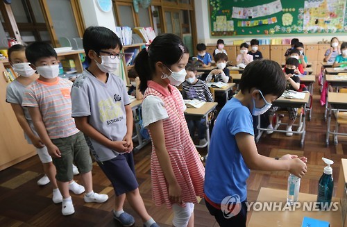 | △ (부산=연합뉴스) 차근호 기자 = 9일 오전 부산시 동래구의 한 초등학교에서 학생들이 중동호흡기증후군(메르스)의 예방수칙의 하나로 수업이 시작되기 전 손 세정제를 바르고 있다. 2015.6.9 ready@yna.co.kr |