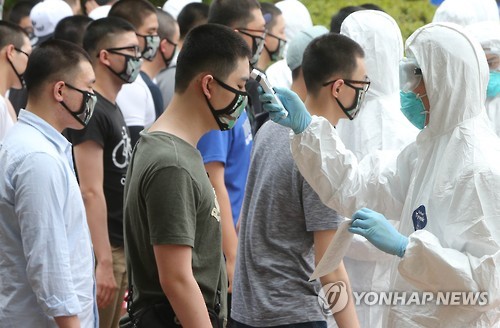 | △ 육군훈련소 메르스 비상 (대전=연합뉴스) 양영석 기자 = 육군훈련소 관계자들이 8일 입영장병을 대상으로 체온검사를 하고 있다. 훈련소는 메르스 확산 방지차원에서 이날 예정된 입영행사를 취소하고, 입영장병 전원의 체온검사를 해 이상이 있는 입소자는 귀가조치했다. 2015.6.8 youngs@yna.co.kr |