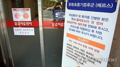 | △ 메르스 누적 환자 세자릿수 초읽기 (서울=연합뉴스) 홍해인 기자 = 중동호흡기증후군(메르스) 확진자 1명이 사망하고 감염 환자 발생 병원이 추가로 발표된 9일 오전 서울 여의도성모병원 응급센터 앞에 메르스 관련 안내판이 세워져 있다. 이날 방역 당국은 지난달 28일 여의도성모병원에서 6번 환자와 같은 병실에 머물던 환자의 사위(88번 환자)가 확진 판정을 받았다고 밝혔다. 이에 대해 여의도성모병원 측은 "이날 확진된 88번 환자(6번 환자의 사위)는 6번 환자가 지난달 26일 서울아산병원에 들를 때부터 동행한 것으로 알고 있다"며 어느 단계에서 감염됐는지 단정하기 어렵다는 의견을 제시했다. |